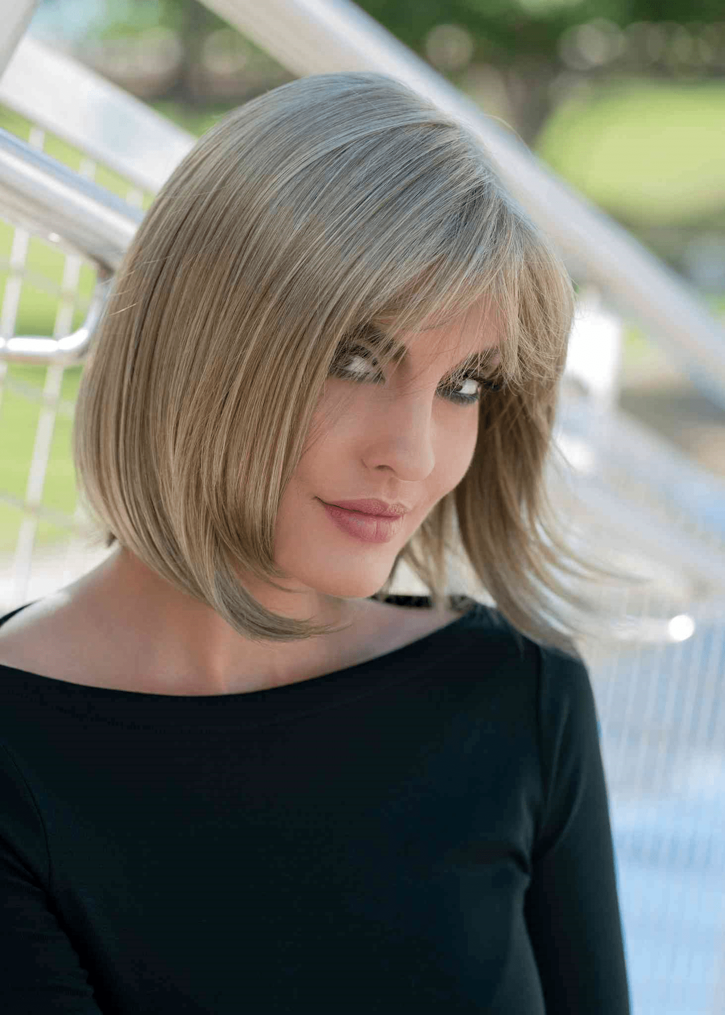 Carley by Envy is a classic bob that frames your face with soft bangs and razor cut layers. The hand-tied monofilament top construction creates the appearance of scalp and natural hair growth where the hair is parted. Tapering layers is the signature to this silhouette. Lightweight and natural looking, Carley is a wig to be envied. Weight is 3.49 oz.