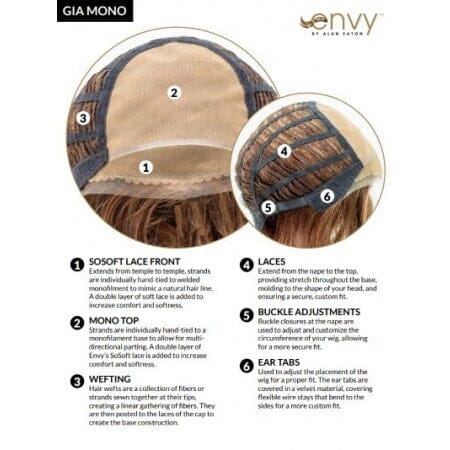 Gia Mono is a sophisticated creation inspired by Envy's best-selling bob style, Gia. Boasting Envy's new SoSoft cap design with and offering varying light-medium density, this medium style exudes effortless elegance with loose, carefree waves. The meticulously crafted lace front and monofilament construction allow the hair to be effortlessly parted in any direction, creating a remarkably natural look. At the core of Envy's SoSoft Cap lies an innovative design that redefines what it means to wear a wig. The "lace front itch" can often detract from the elegance and confidence a wig provides. We've ended this discomfort with an exclusive technology that prioritizes your needs. The cap ensures breathability and a gentle touch against the skin, eliminating irritation without compromising on fit or style, with a double layer of soft lace on the lace front and mono top areas.