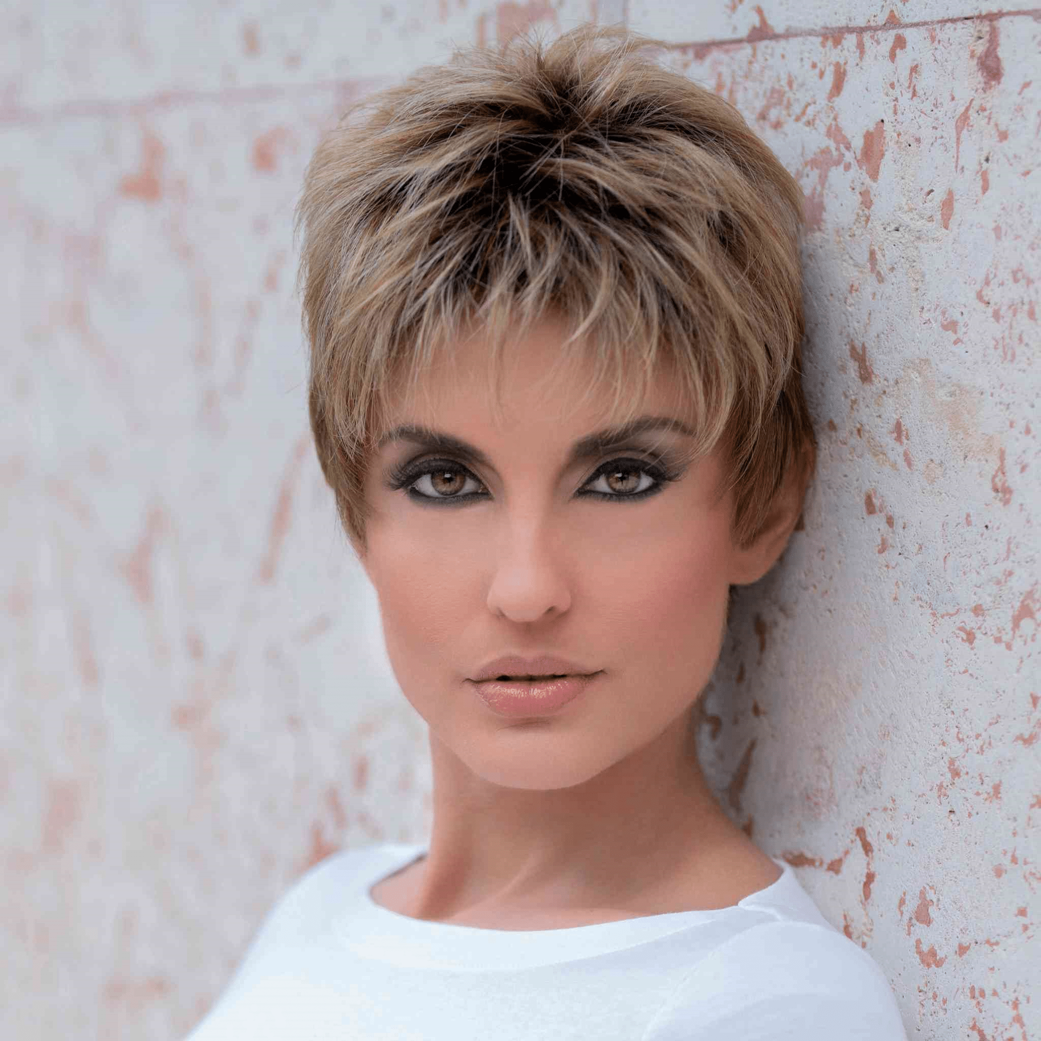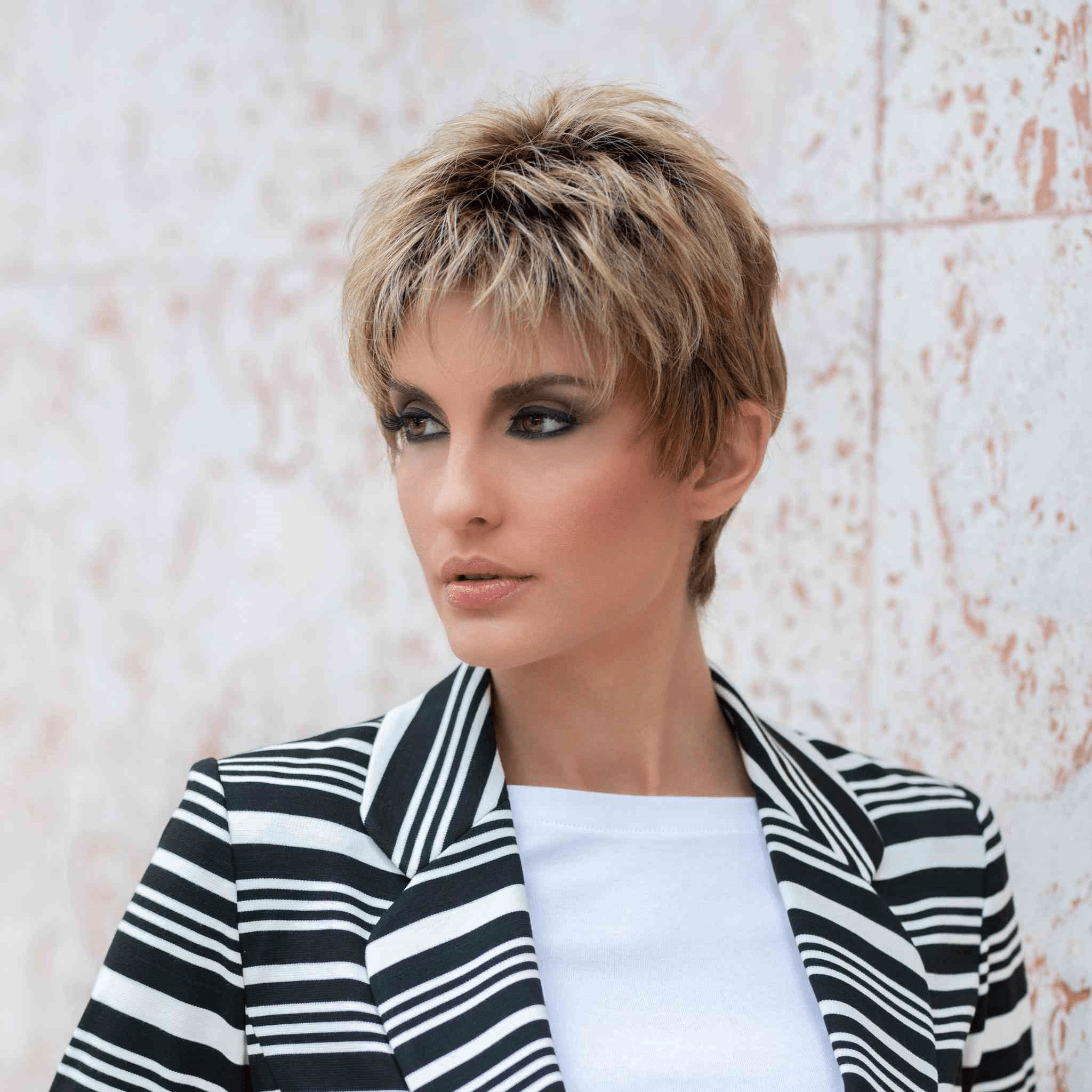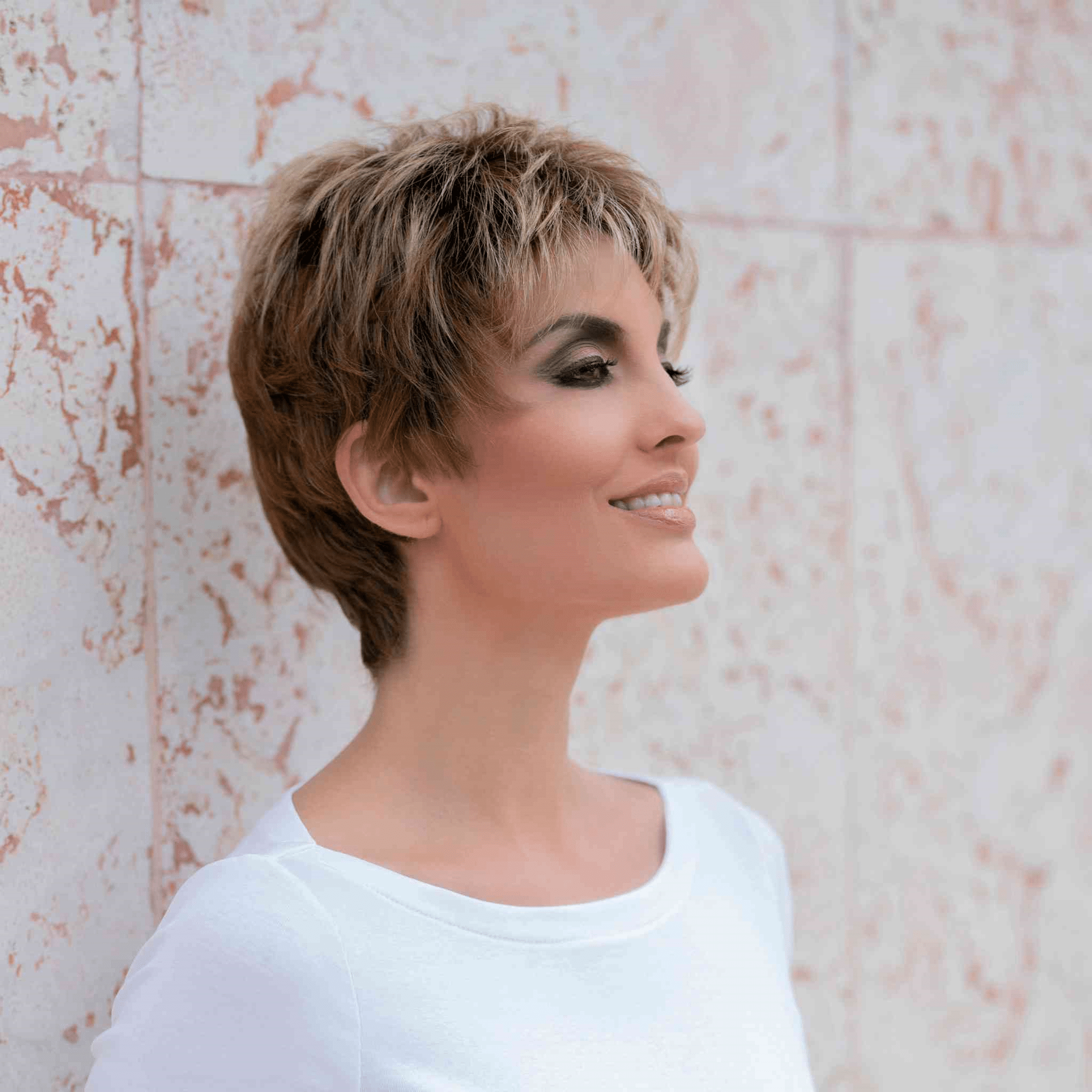 A sophisticated boy-cut designed with textured spiky layers and an open top construction for breathability. Style it up or comb it down for a less airy appearance. Versatile styling at its best. Open Top Capless construction, machine made wig with wefted sides and backs, buckle closures at nape for adjustments. Open ear tabs with adjustable material to help hug the ear area. Petite cap size