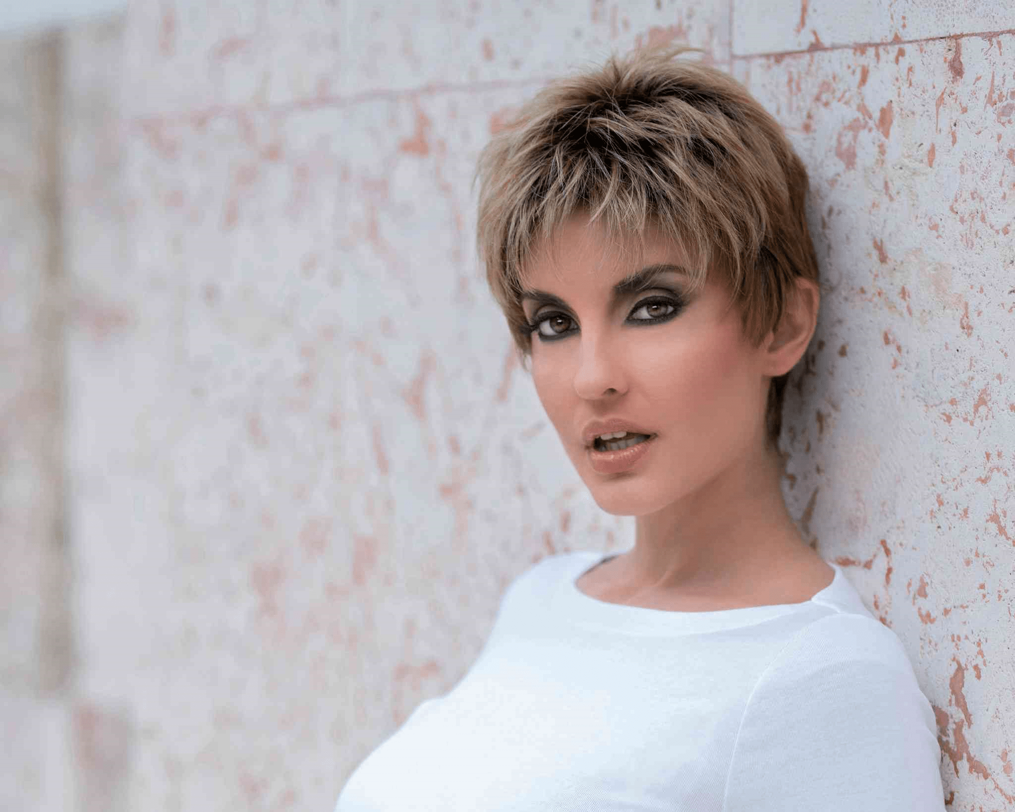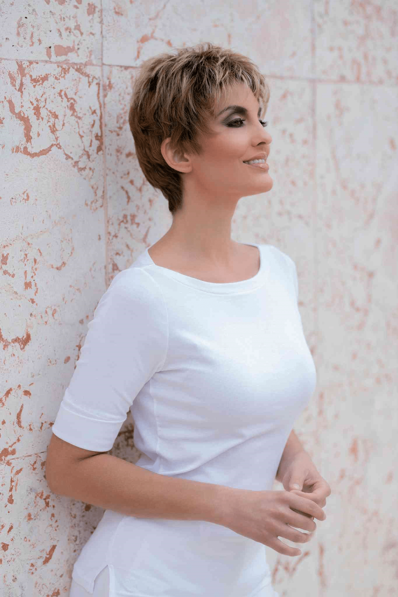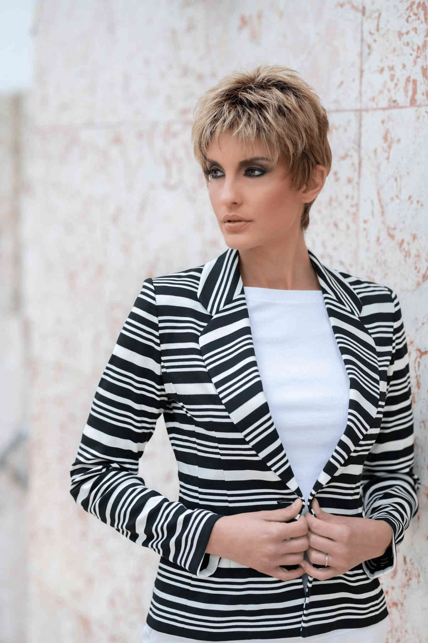 A sophisticated boy-cut designed with textured spiky layers and an open top construction for breathability. Style it up or comb it down for a less airy appearance. Versatile styling at its best. Open Top Capless construction, machine made wig with wefted sides and backs, buckle closures at nape for adjustments. Open ear tabs with adjustable material to help hug the ear area. Petite cap size