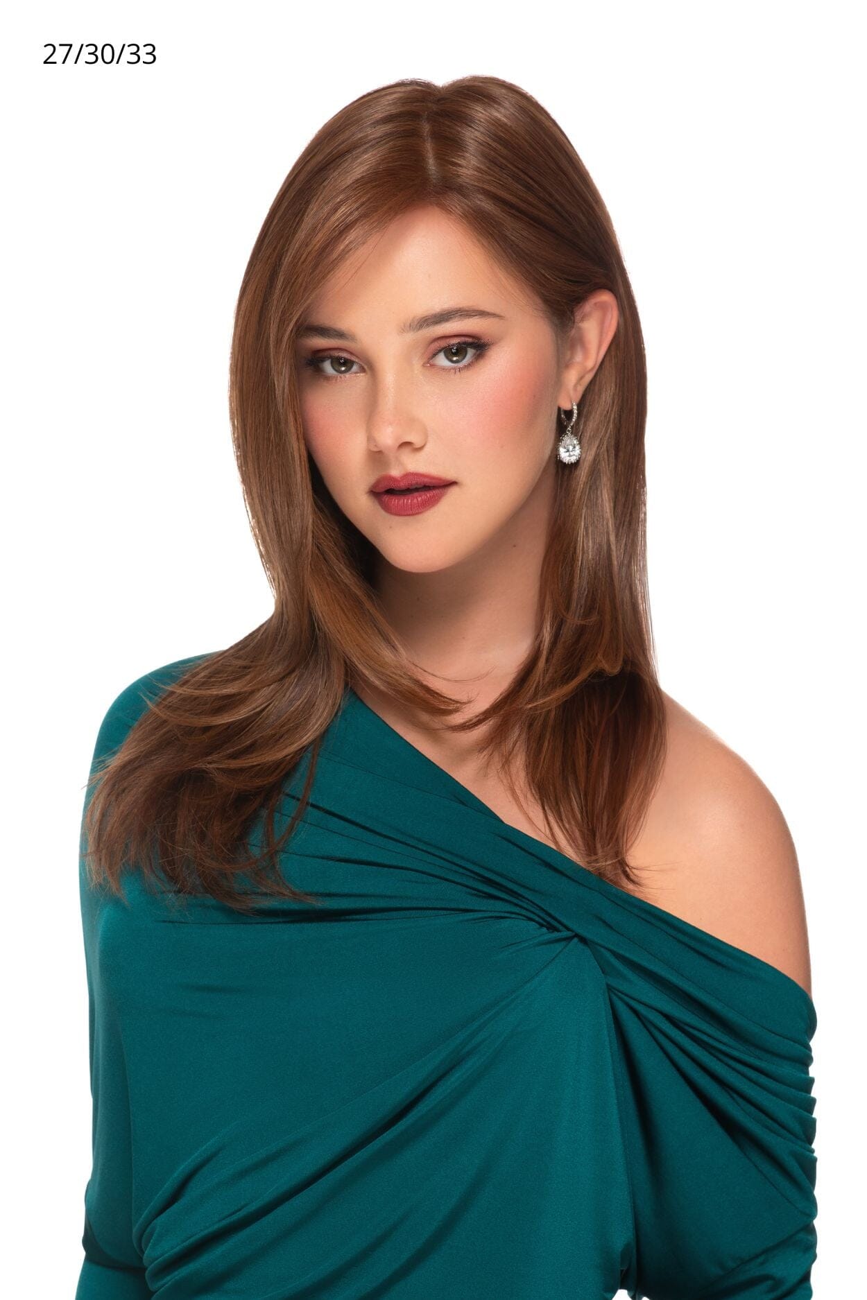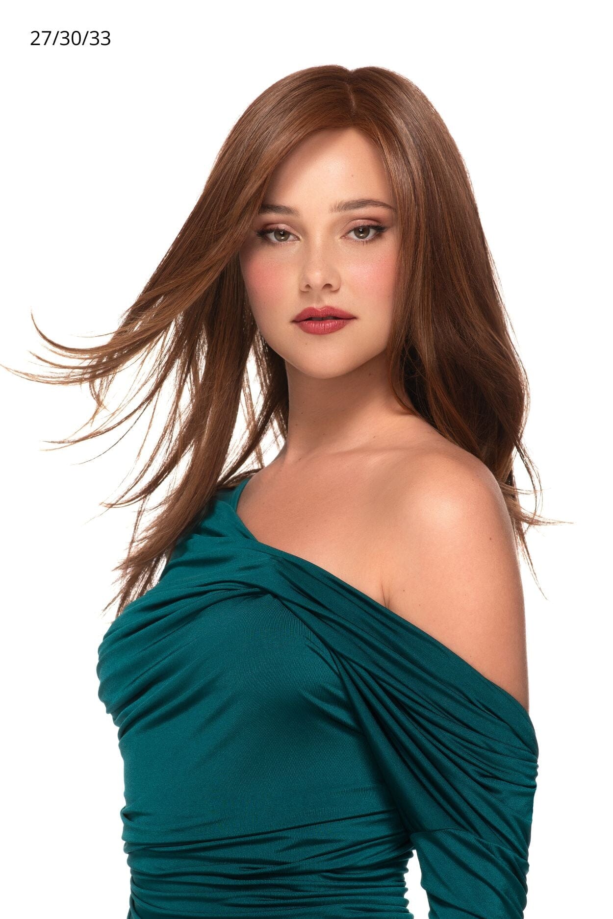 Sizzle features sleek tapered layers that fall to the mid back and face-framing curtain bangs for a versatile and stylish look. Its Sheer Comfort cap and hand-knotted monofilament mesh provide all-day comfort and an undetectable hairline. With the added option to brush back or pull into a ponytail, Sizzle is both practical and fashionable.