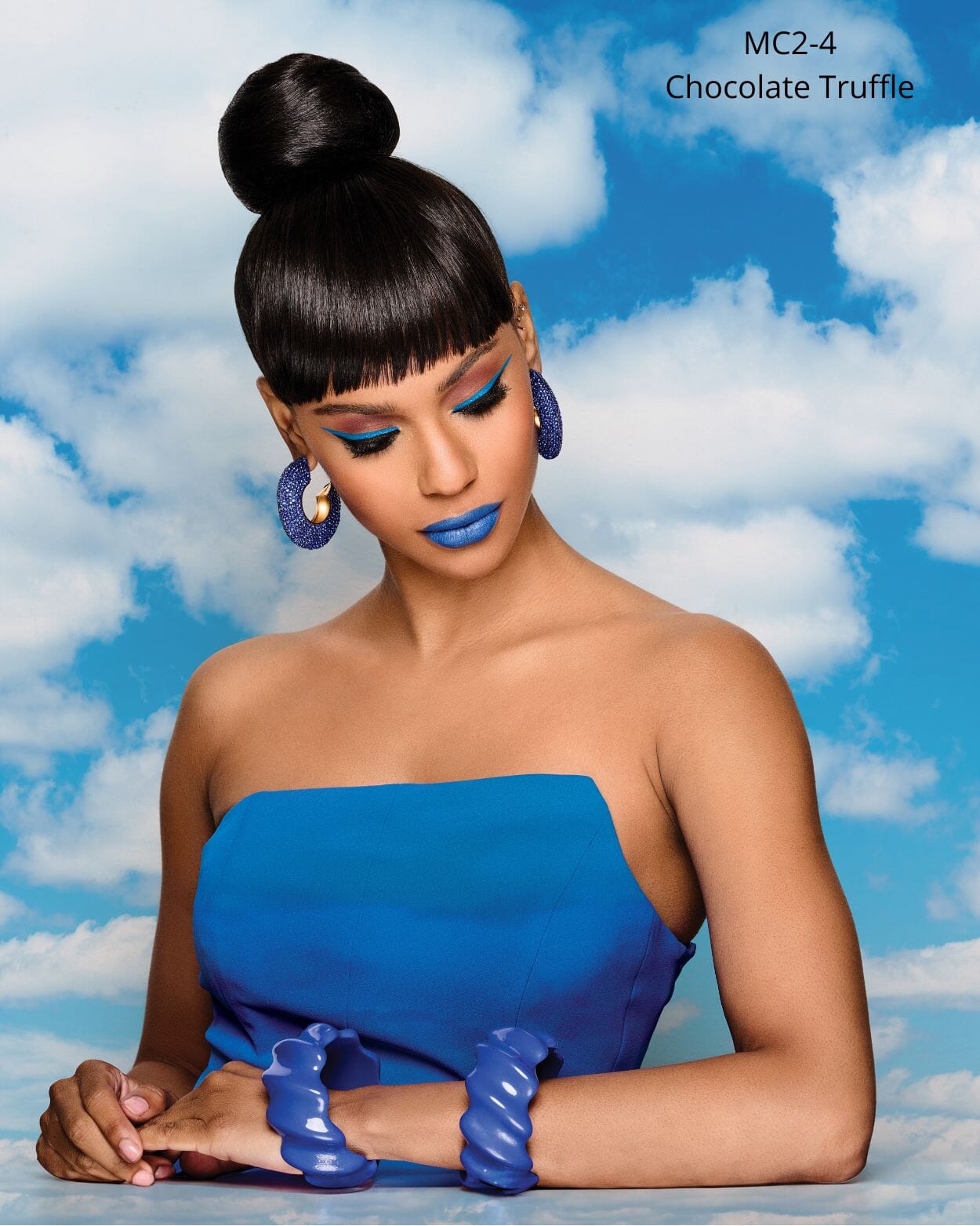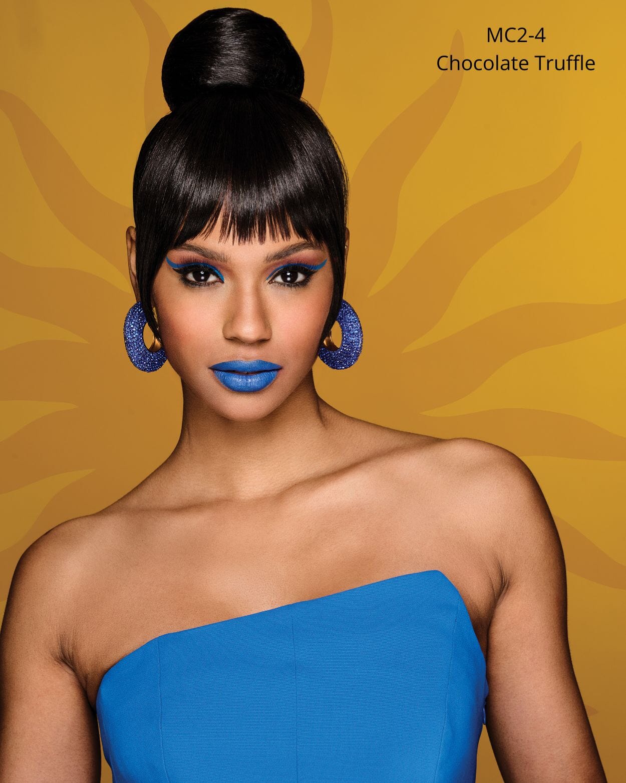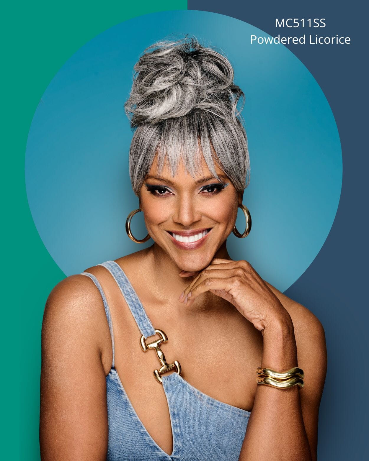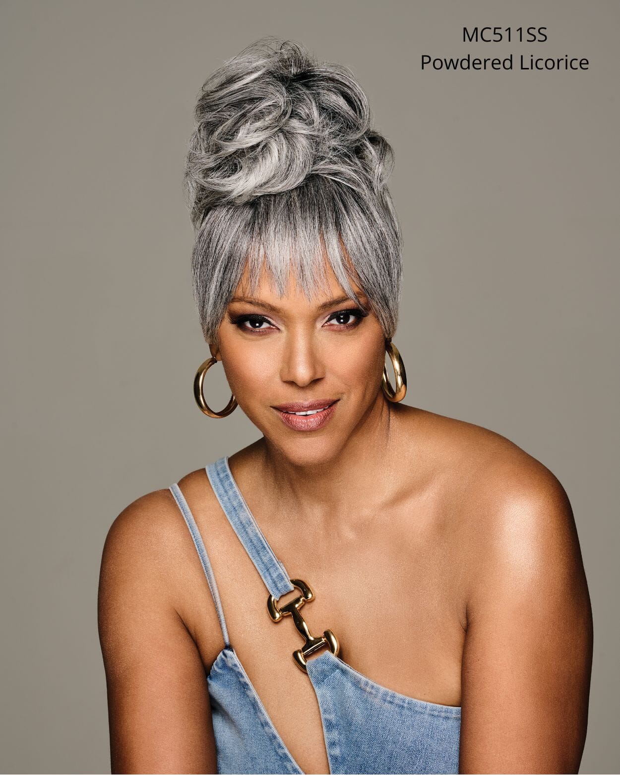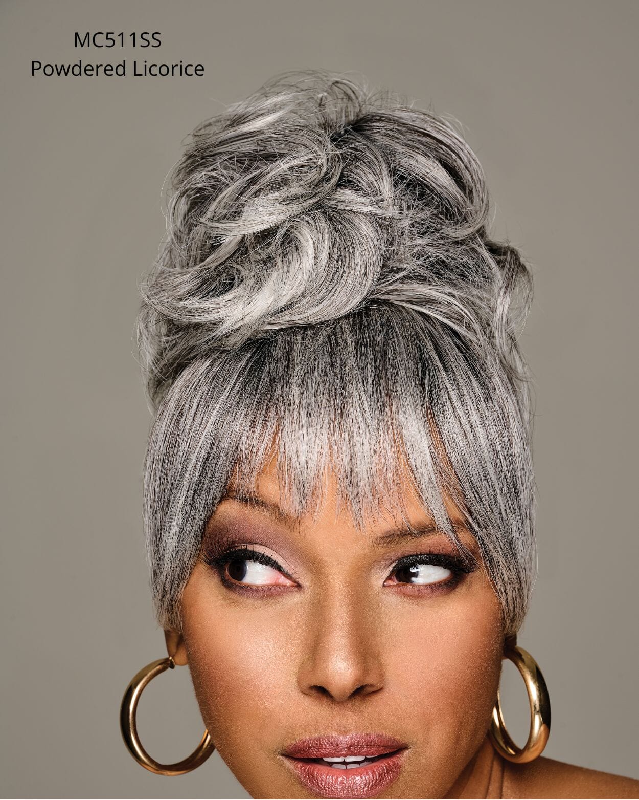 Achieve the ultimate combination of classic bangs and a full bun with this sleek style bun by Kim Kimble. Whether you prefer a messy or polished look, this bun allows you to effortlessly create a ballerina-inspired updo. The face-framing fringe features layered, longer side pieces that can be seamlessly blended with your own hair, swept behind the ear, or left to frame your face.