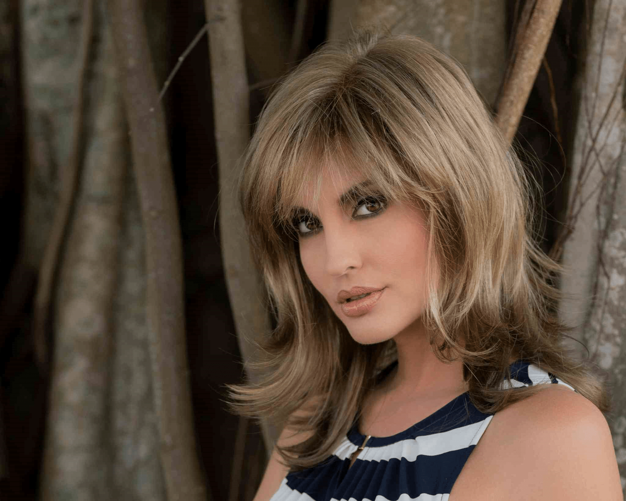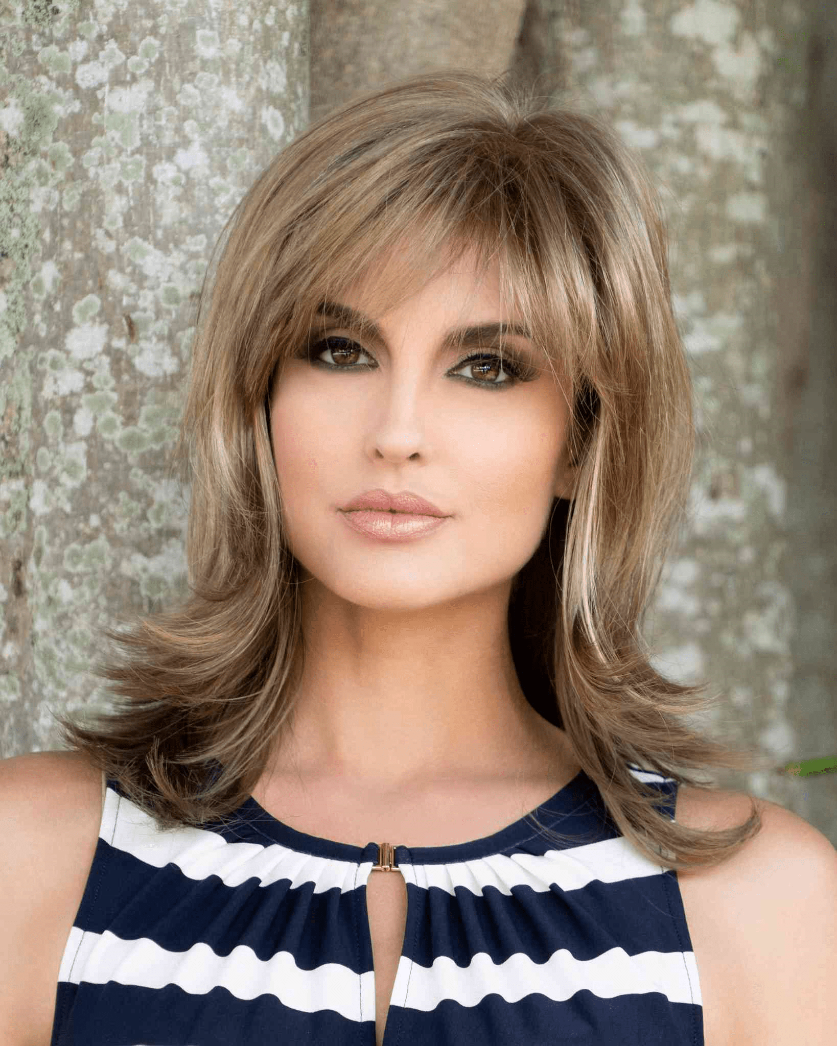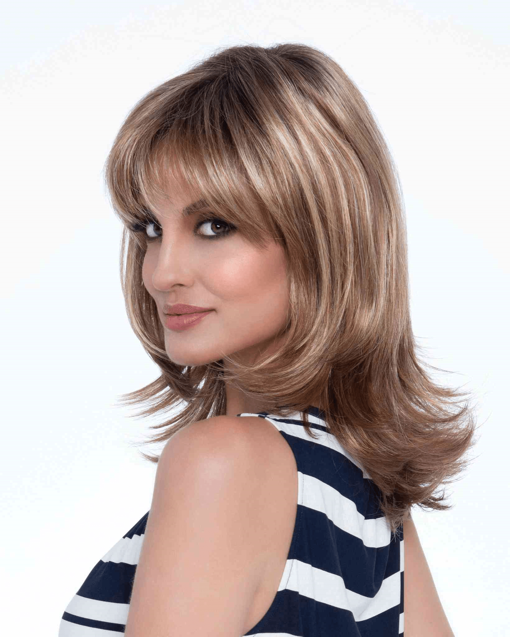 Nadia by Envy Wigs is a medium length layered synthetic wig with soft bangs. Nadia features a hand-tied mono part for a natural looking part from any angle. Layers and ends are flipped up and provide natural movement. Shoulder skimming layers gives this style movement with added volume for an instant lift.