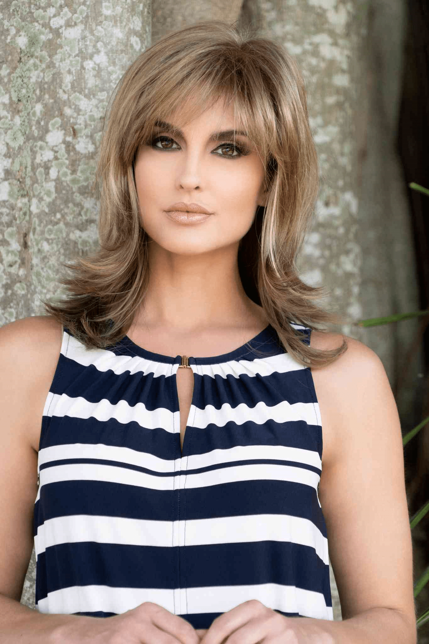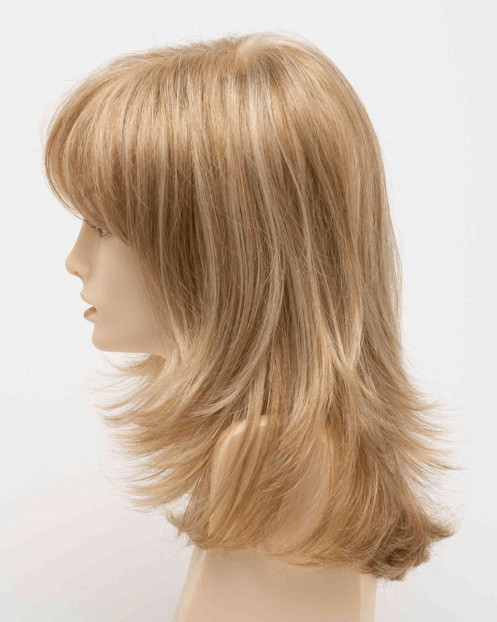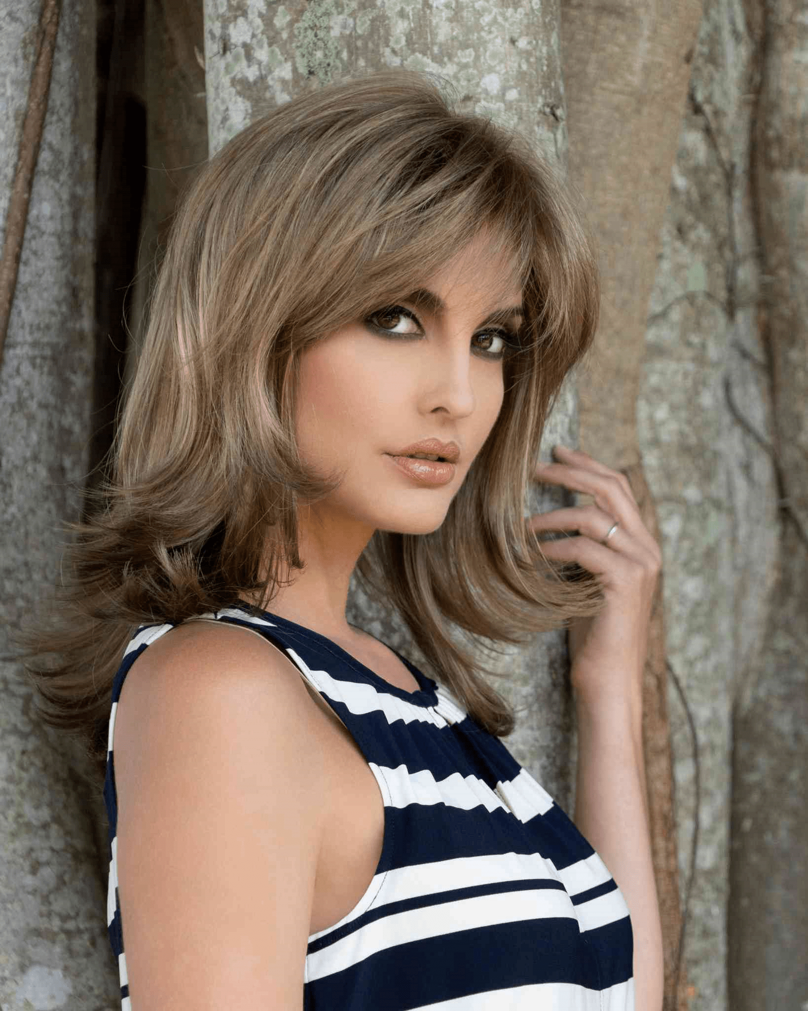 Nadia by Envy Wigs is a medium length layered synthetic wig with soft bangs. Nadia features a hand-tied mono part for a natural looking part from any angle. Layers and ends are flipped up and provide natural movement. Shoulder skimming layers gives this style movement with added volume for an instant lift.